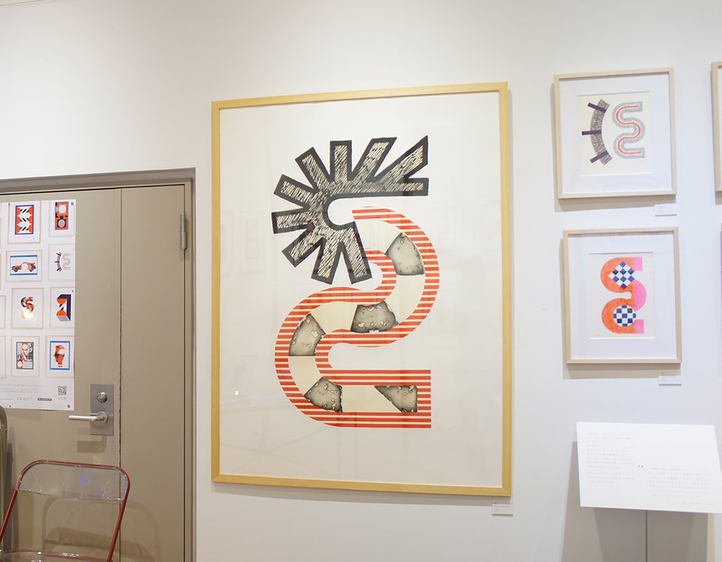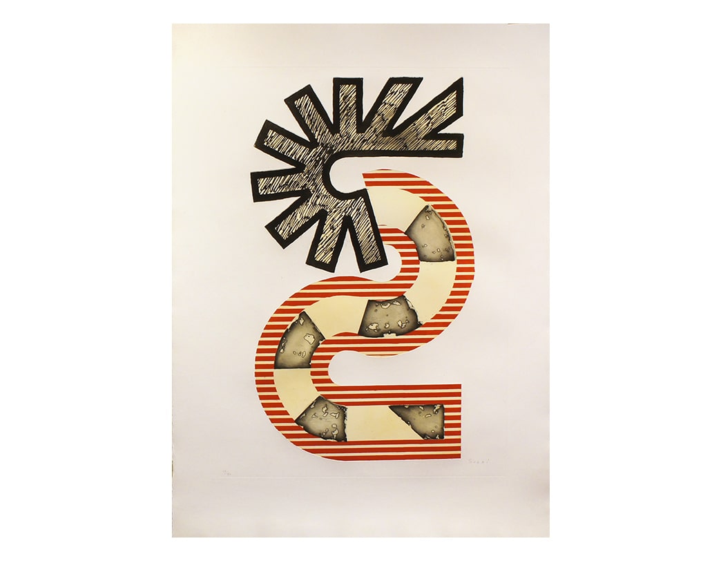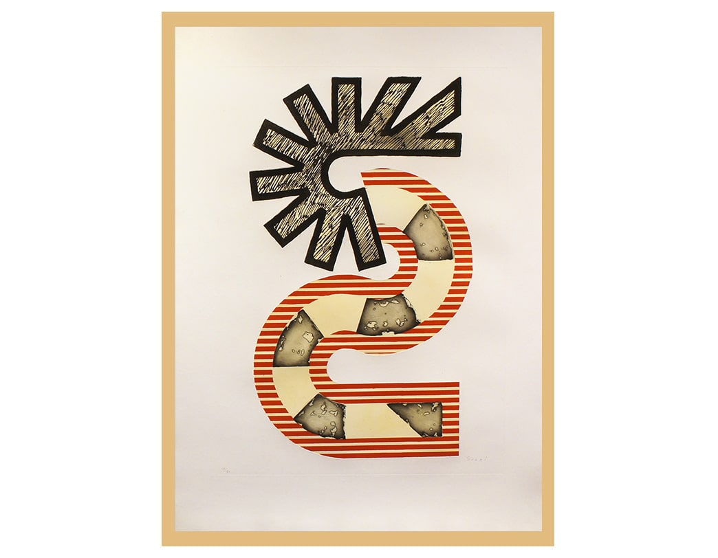 This particular piece features a motif of two stylized S shapes arranged in opposite directions, embodying the elegant curves and bold abstraction that characterize Sugai’s mature style.