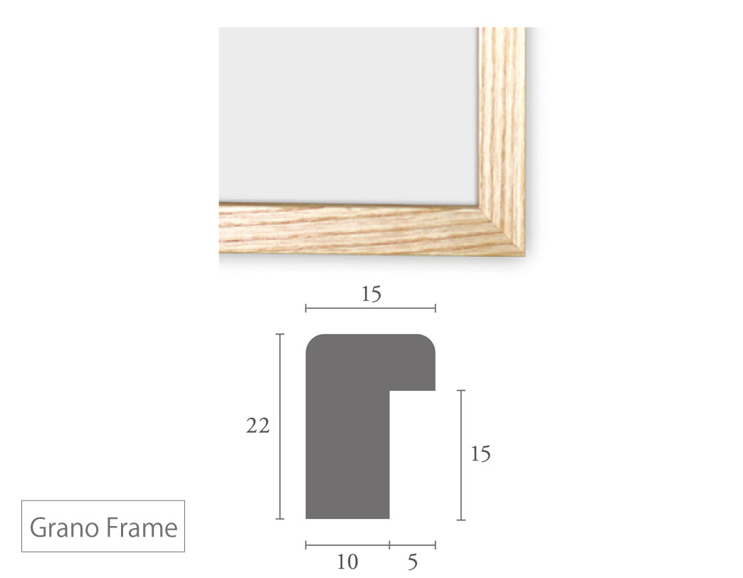 The Grano Frame is made of ash wood with a clear finish, offering a natural and warm appearance.