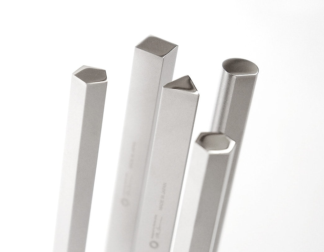 Designed by product designer Michio Akita for the Primario series, this TAKEDA “C-rest” set includes five shapes—triangle, square, pentagon, hexagon, and cylinder—each offering a unique look. Though it appears like aluminum, the solid stainless steel provides satisfying weight.