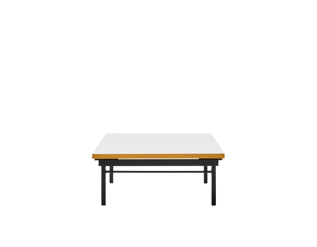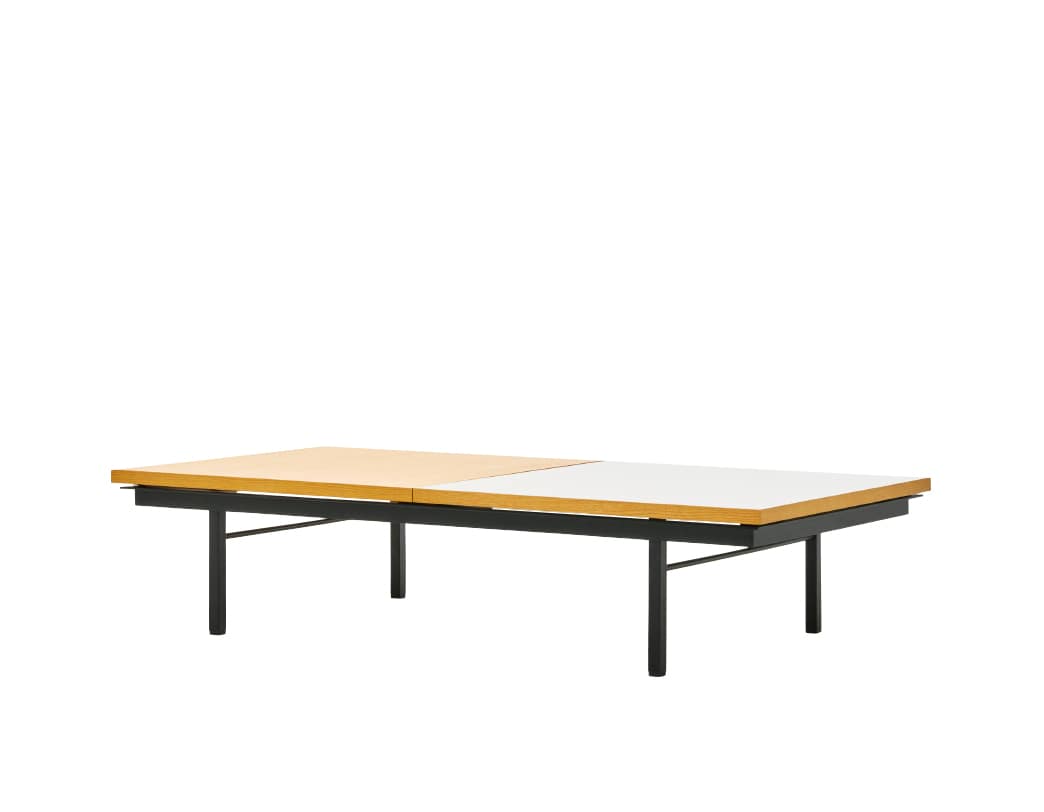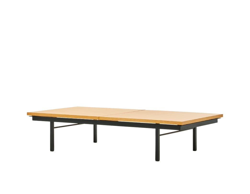 This low table features a clean, modern structure with a steel frame supporting two layered tops. Choose from an oak veneer or white melamine surface, both finished with oak edges for a refined touch.